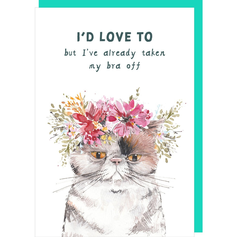 Here’s something new for the girls, introducing the Tipp Top range, designed collaboratively with Tipperleyhill. A hilarious card with an image of a cat looking a little grumpy wearing a crown of flowers, the caption reads, “I’d love to but I’ve already taken my bra off”. This card is blank inside for your own birthday message, and comes with a bright aqua coloured envelope. Designed and printed in the UK on luxury FSC approved card.
