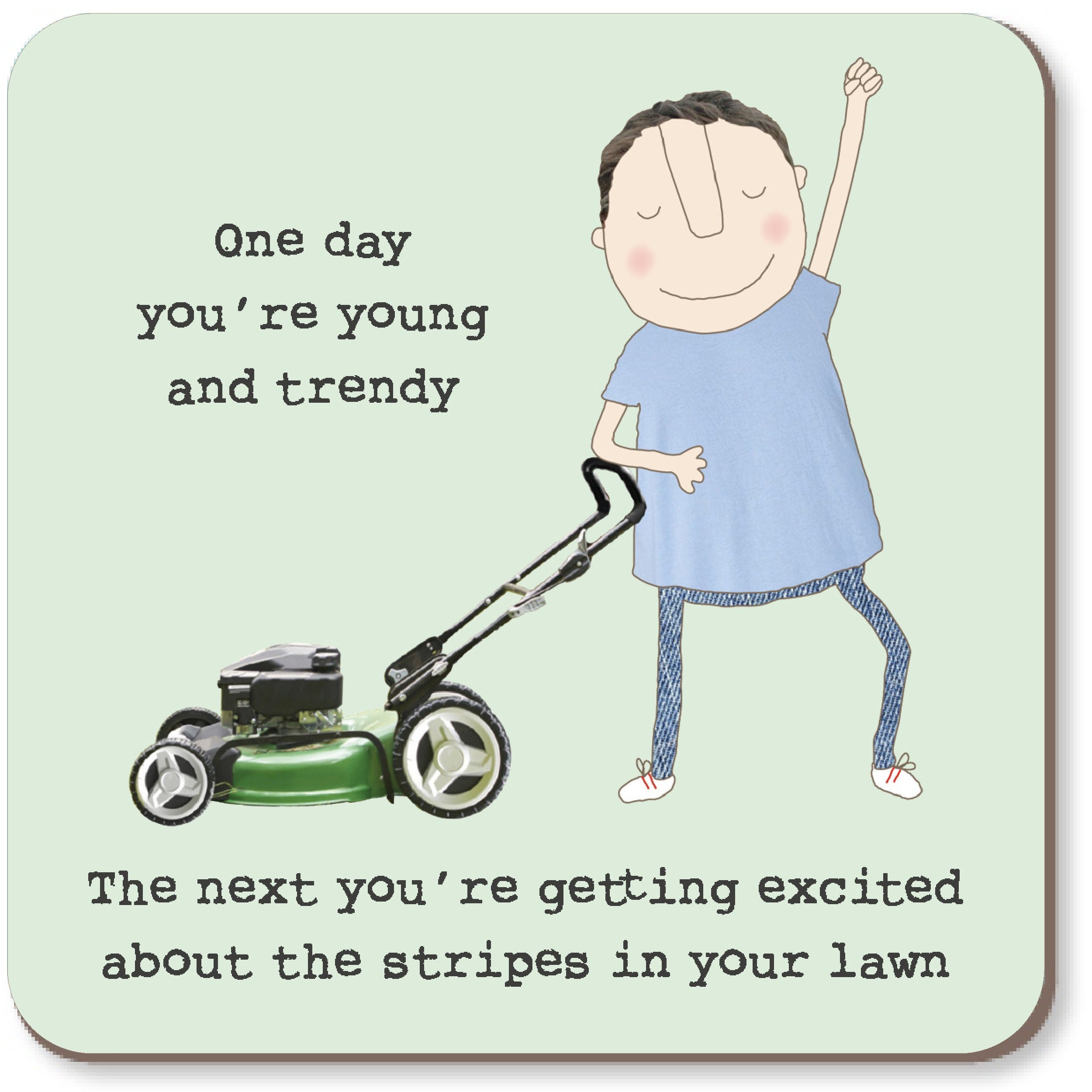 Drinks coaster to make you smile! Makes a great little gift for a lawn proud Dad. Caption reads ‘One day you’re young and trendy. The next you’re getting excited about the stripes in your lawn’. All of our coasters are cork backed and have a tough, matt finish which makes them pretty good at resisting heat, water and scratches.