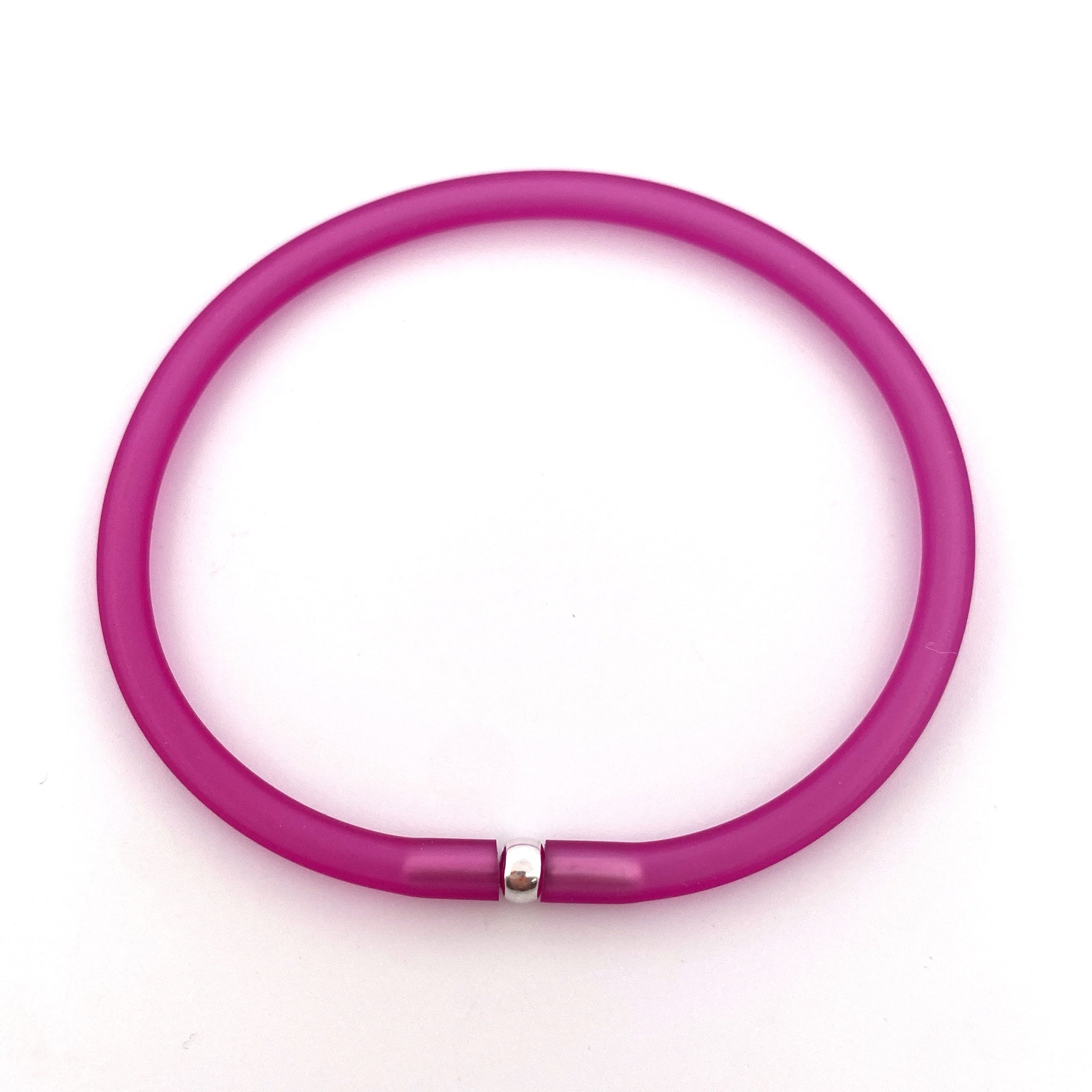 These fun, brightly coloured silicone bracelets can be worn alone or in a group. Due to their smaller width they can be stacked in multiple colours for maximum impact.