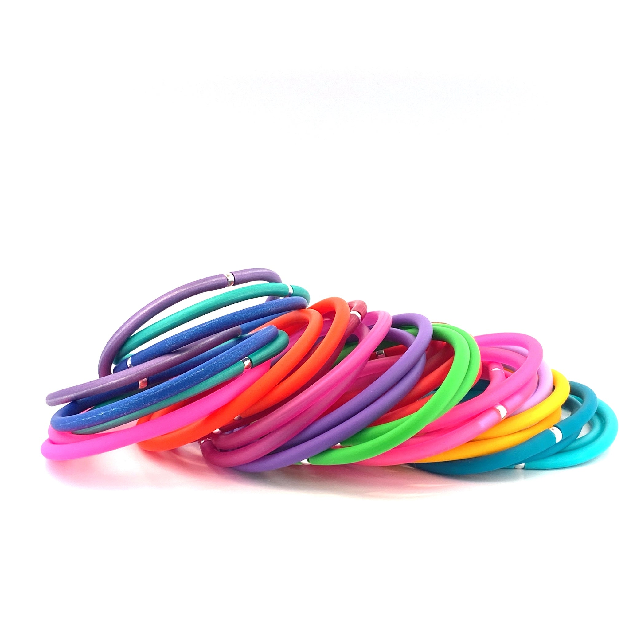 These fun, brightly coloured silicone bracelets can be worn alone or in a group. Due to their smaller width they can be stacked in multiple colours for maximum impact.