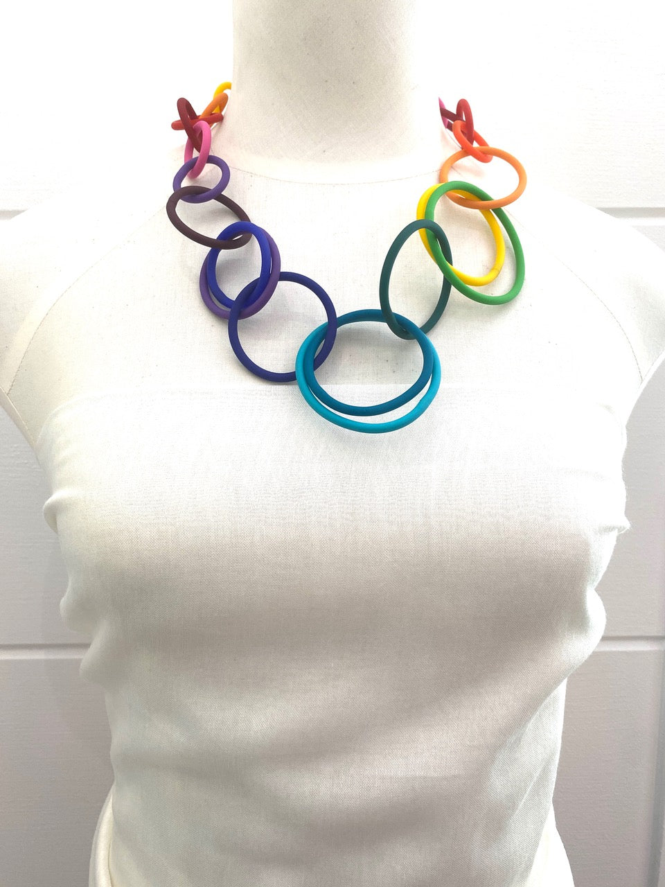 An eye-catching necklace that's lightweight to wear whilst still creating a statement style. This playful design features a variety of interlocking loops in a mix of colours producing a chain style necklace and making it the go-to-piece for travel accessories.