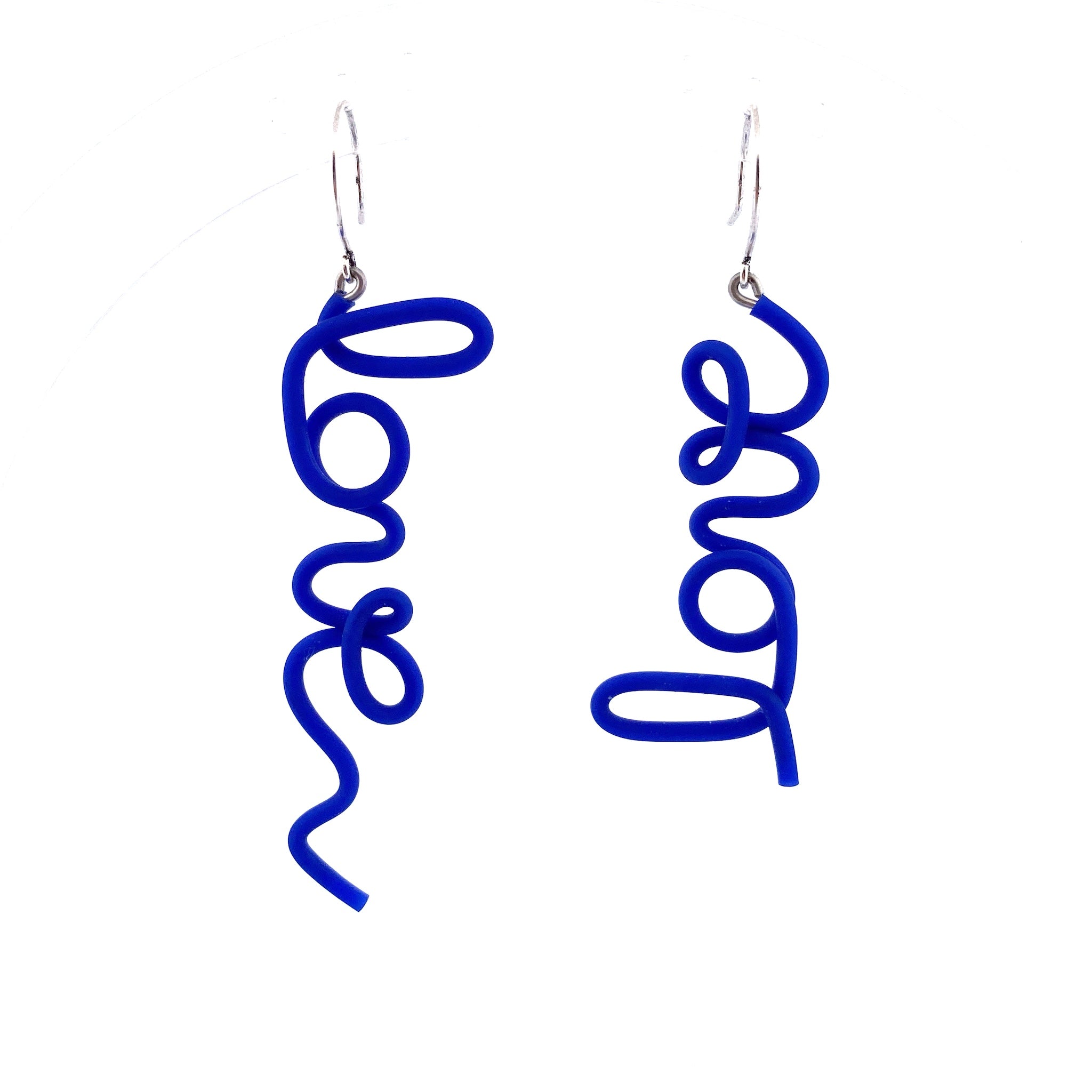 The Samuel Coraux Love Earrings are a firm favourite. A perfect gift to treat yourself or a special friend to a little love. Made from finer plastic-covered wire with a shiny gloss finish they are wound into the word love. These asymmetrical earrings are deliberately designed to hang with the word reading in opposite directions and are also slightly different in shape as they are handmade.