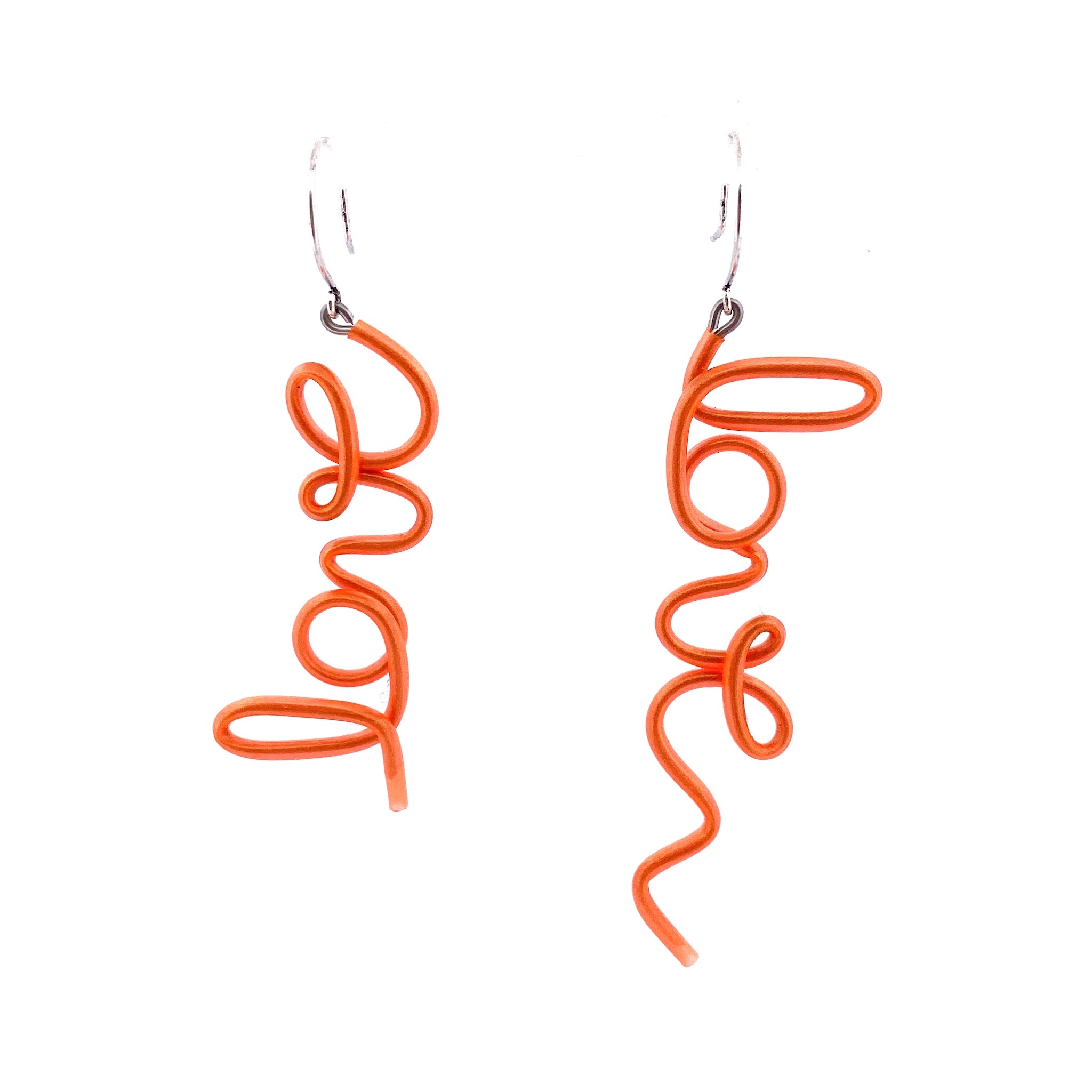 The Samuel Coraux Love Earrings are a firm favourite. A perfect gift to treat yourself or a special friend to a little love. Made from finer plastic-covered wire with a shiny gloss finish they are wound into the word love. These asymmetrical earrings are deliberately designed to hang with the word reading in opposite directions and are also slightly different in shape as they are handmade.