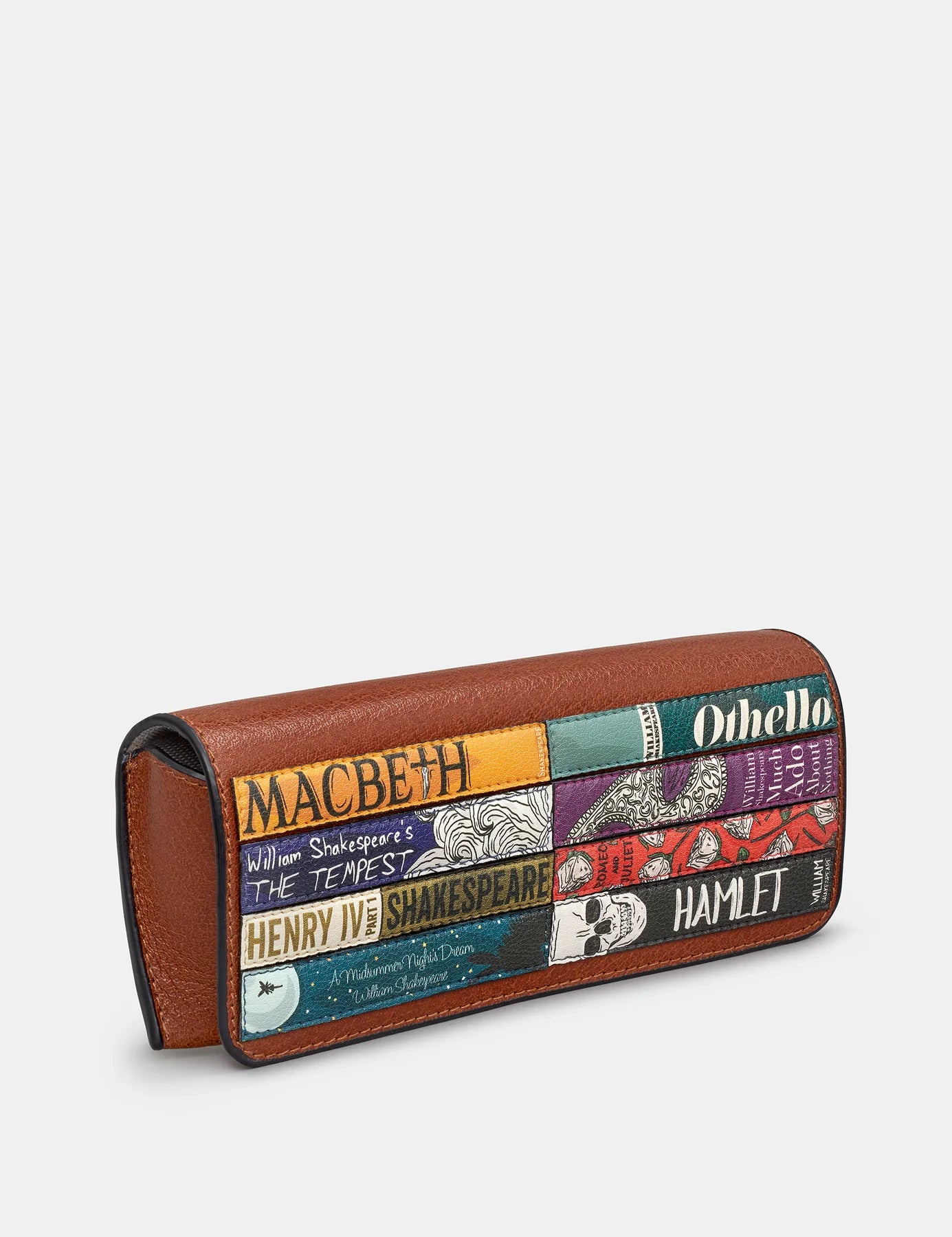 Protect your glasses or sunglasses with this leather glasses case which has been finished in a brown leather with a slight vintage look which compliments the striking book appliques on the front. This glasses case features classics from William Shakespeare and makes the perfect gift. This book themed glasses case is fastened with a magnetic fastener.