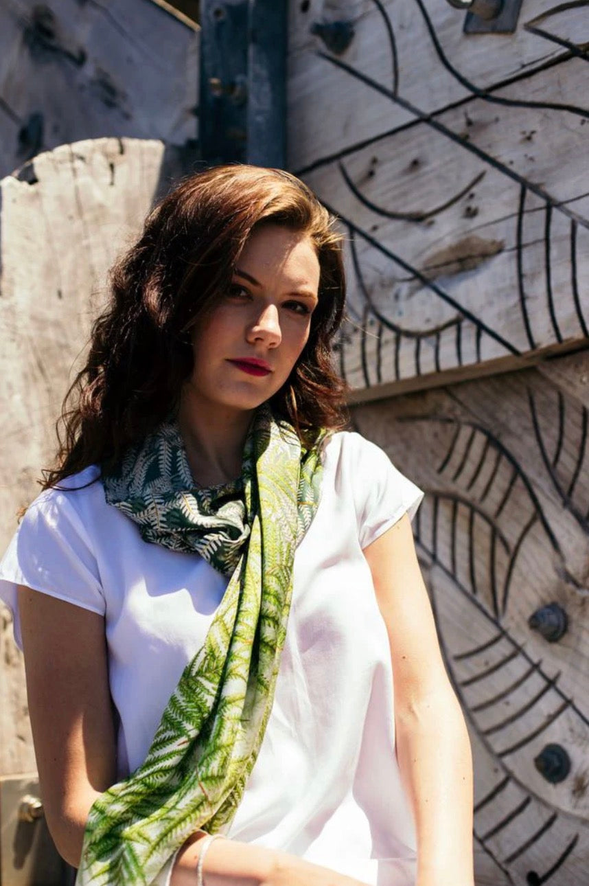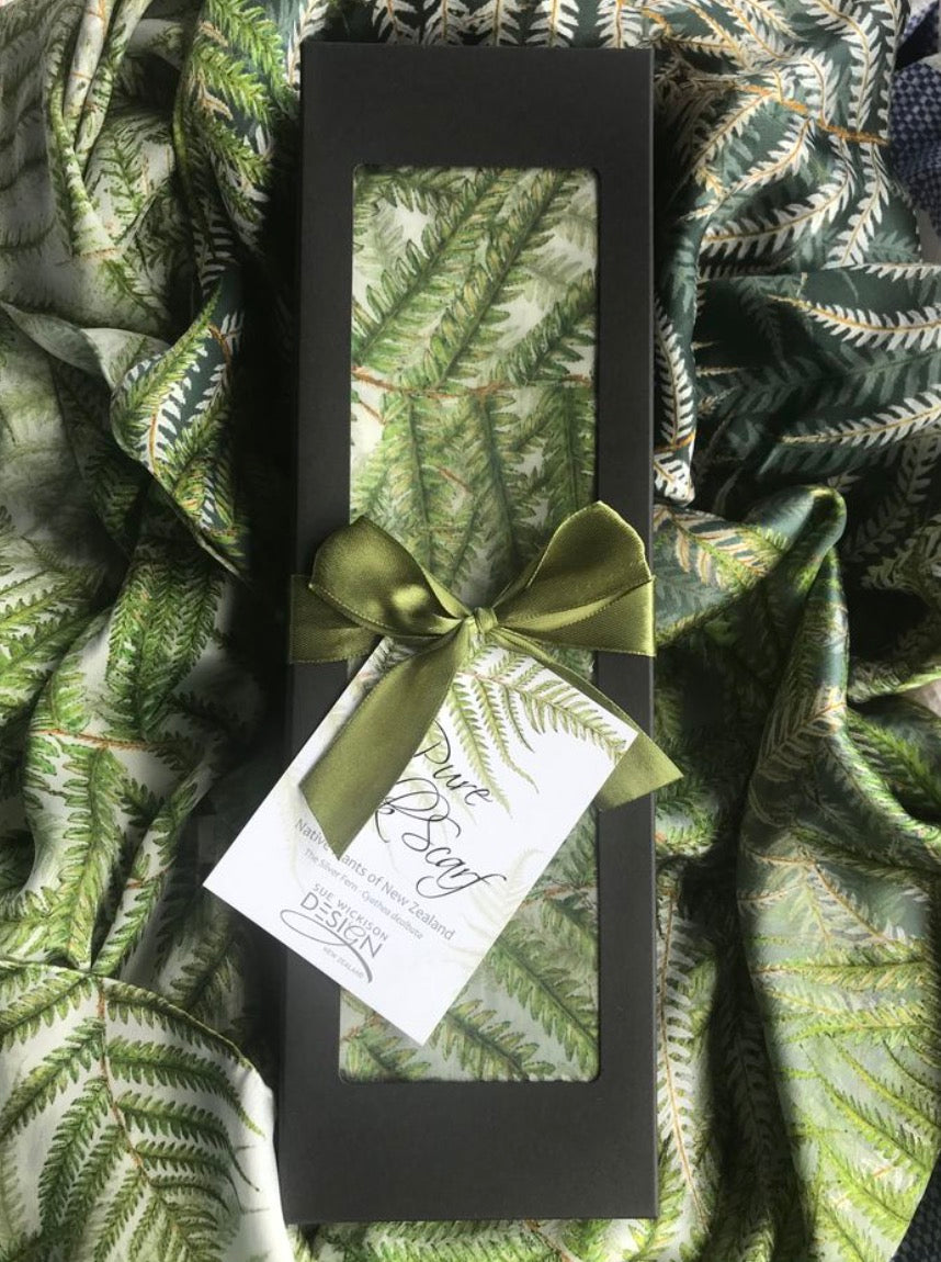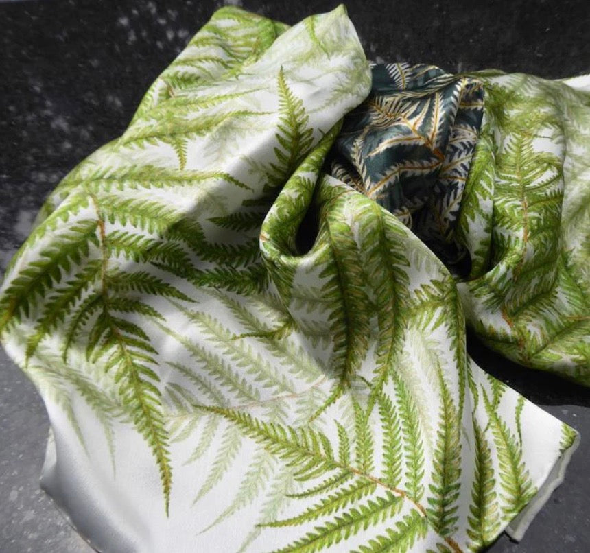 The silk scarf design is taken from an original painting of the endemic New Zealand Silver Fern Cyathea dealbata.