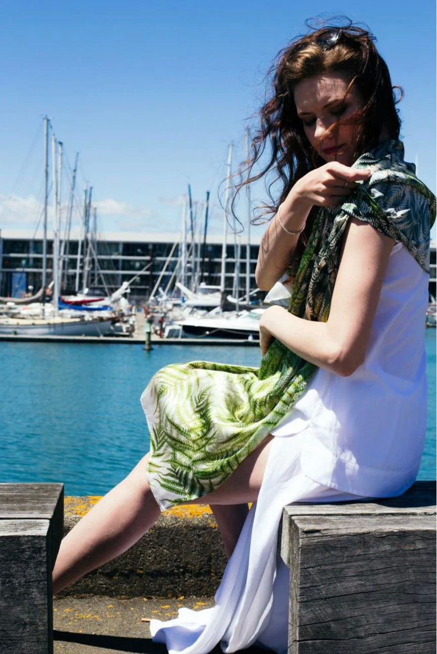 This iconic tree fern, also known as ponga, is a symbol commonly associated with the country both overseas and by New Zealanders themselves. The scarf design is an amalgamation of the upper side of the frond, which is green, and the silver underside that is characteristic of the plant. The dark teal colour in the centre of the scarf gives an interesting colour change to the design and accentuates the silver of the ferns. The silver fern can grow to a height of 10 metres and occurs throughout New Zealand.