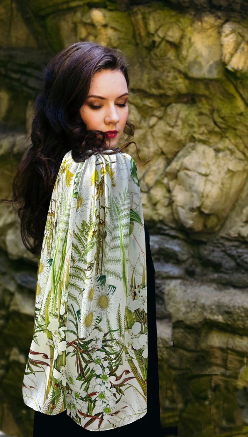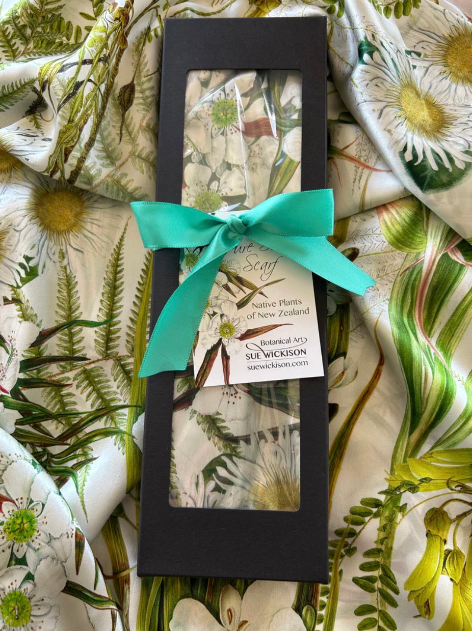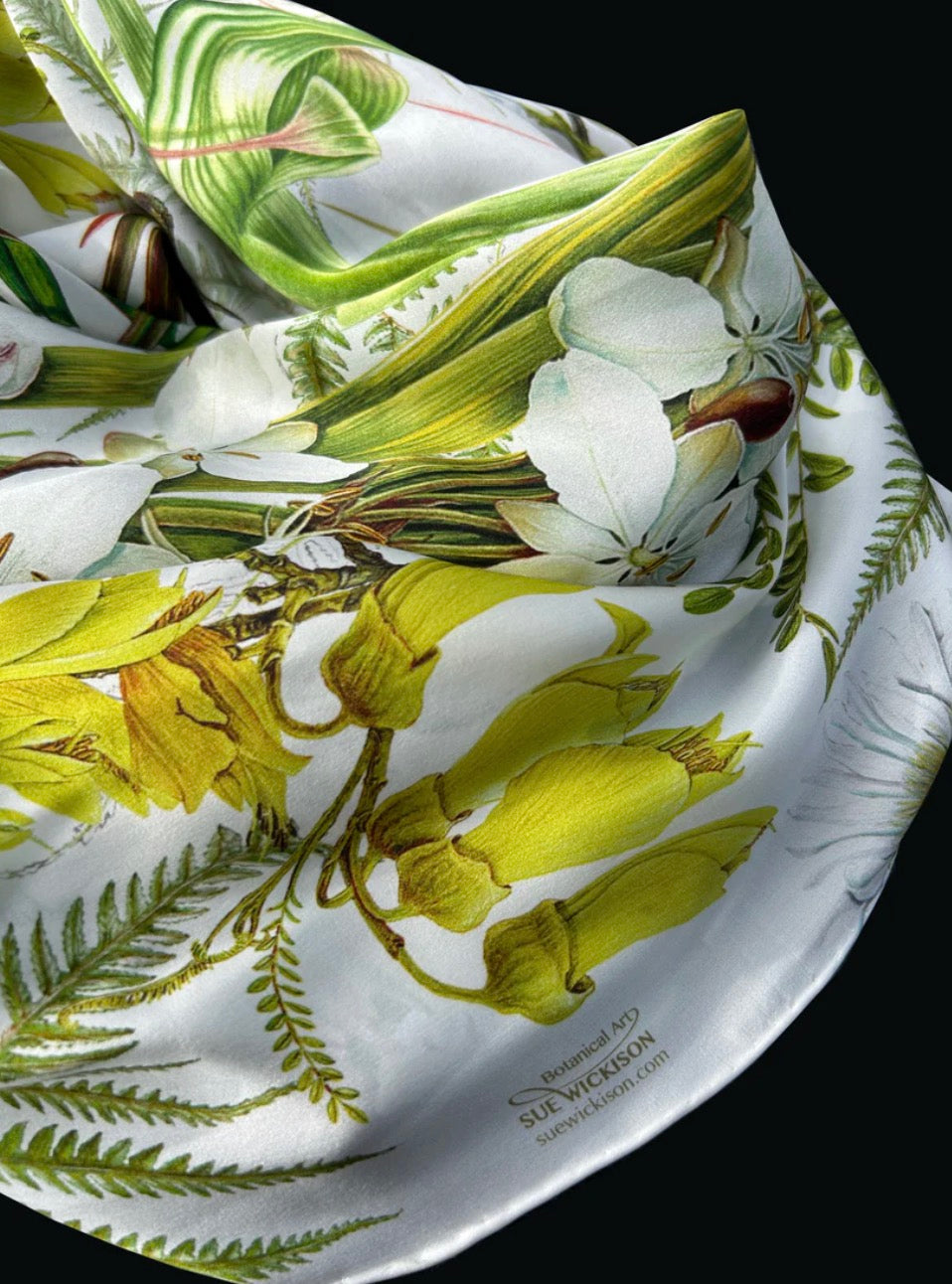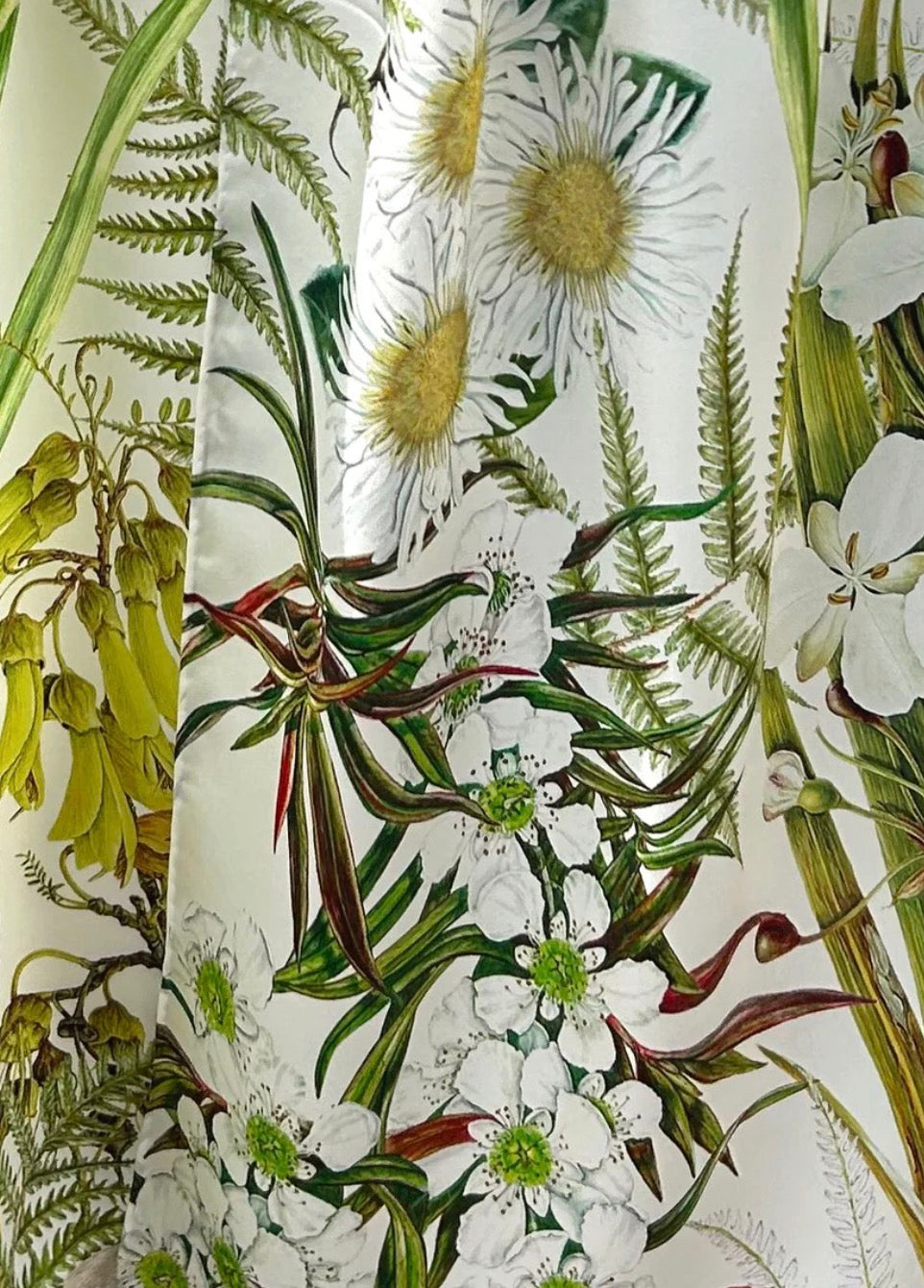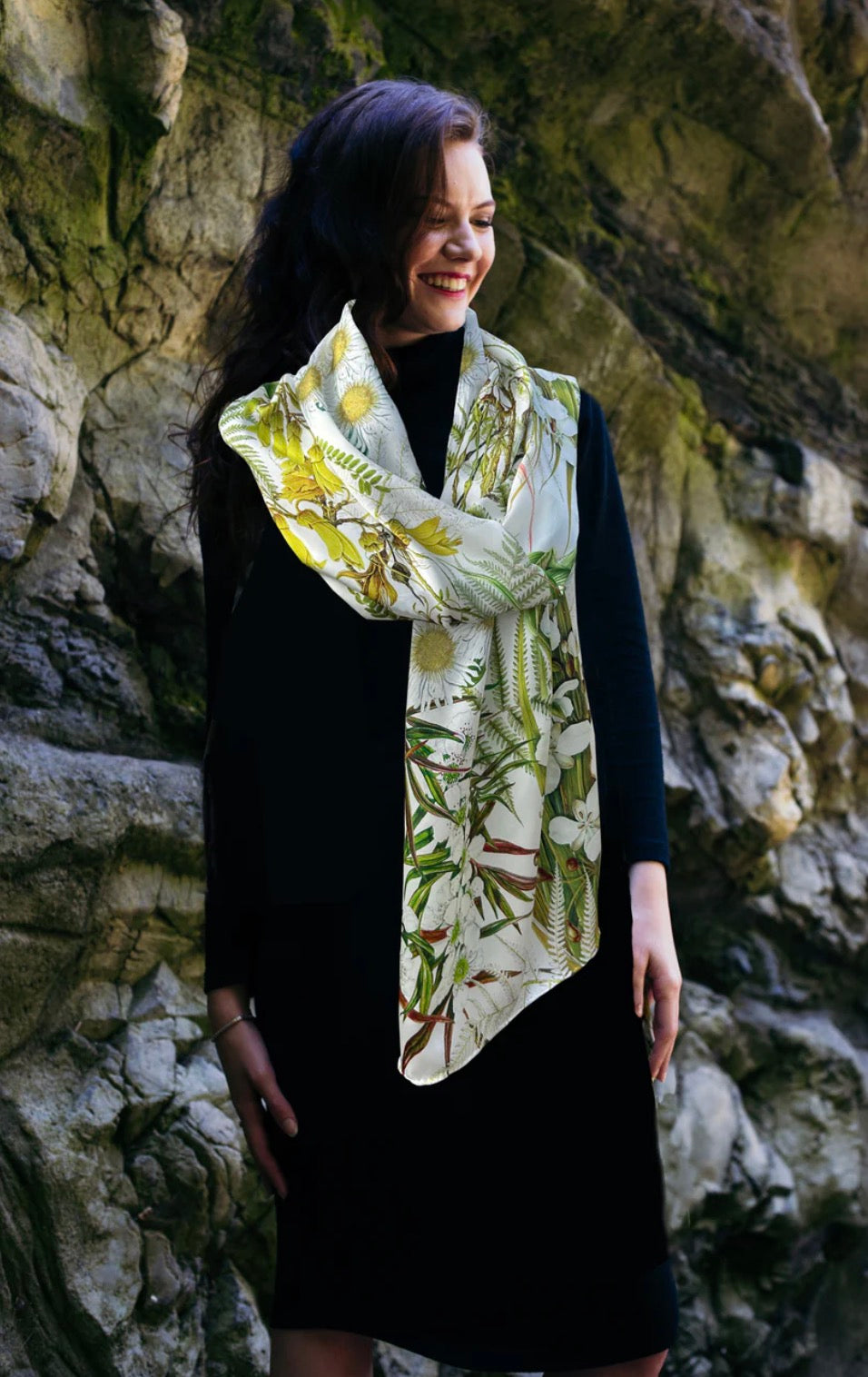 This graceful silk scarf captures the refined beauty of New Zealand’s endemic native plants in a restrained palette of soft greens, whites, and the golden accents of Kōwhai blooms. A quieter composition with a crisp, contemporary feel - perfect for those who lean into elegant sophistication.