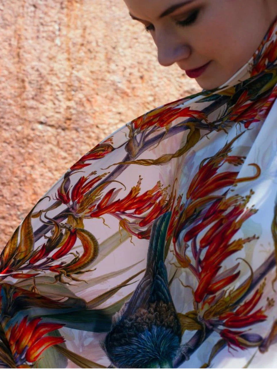 Hand-stitched rolled hems, satin silk 12 mm. Colourfast and expertly printed to capture the fine detail of the original artwork of internationally renowned artist Sue Wickison.