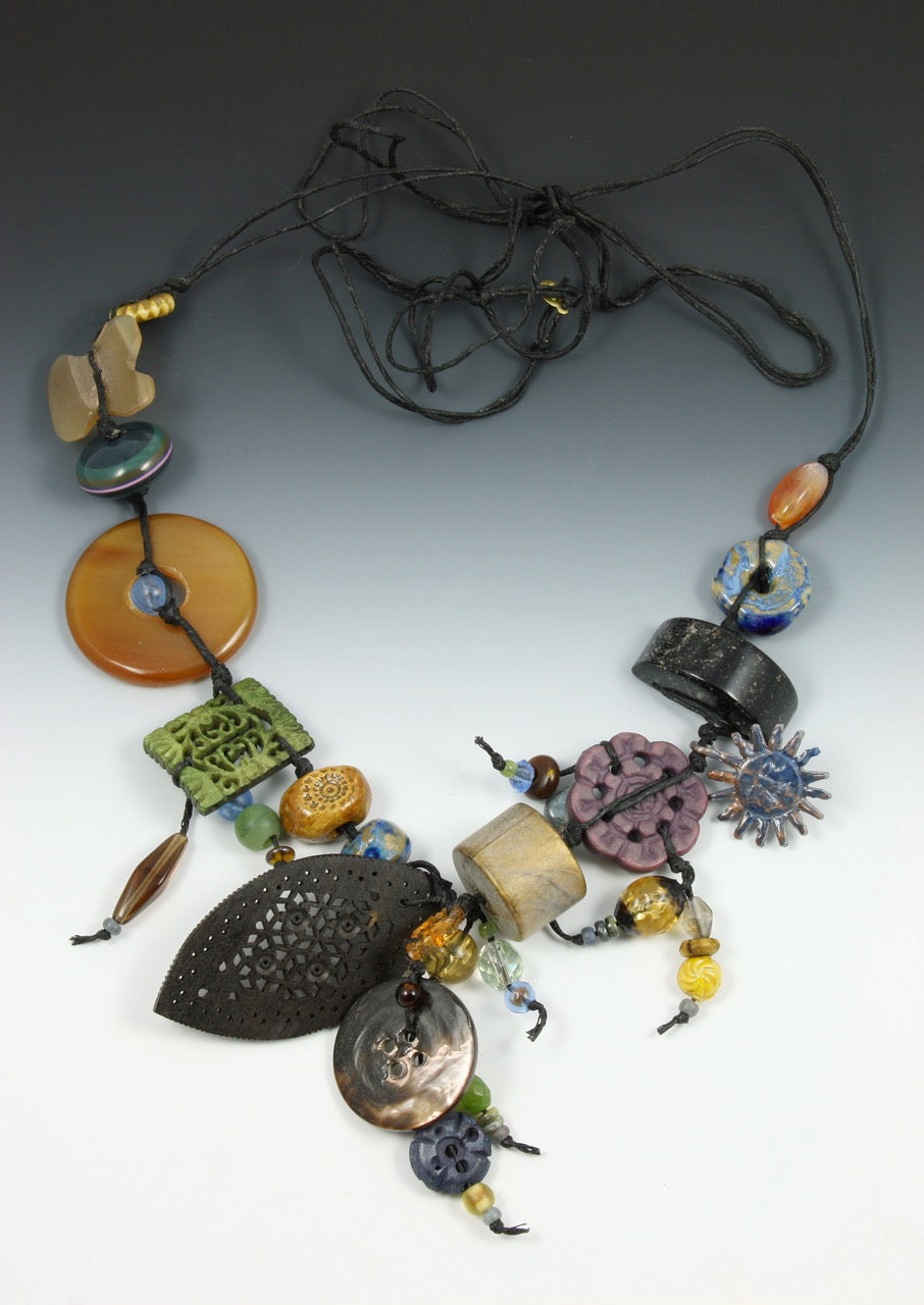We are fortunate to have a few pieces of Teresa's work. This piece features many of these as well as stonewear beads, horn, and pearl.