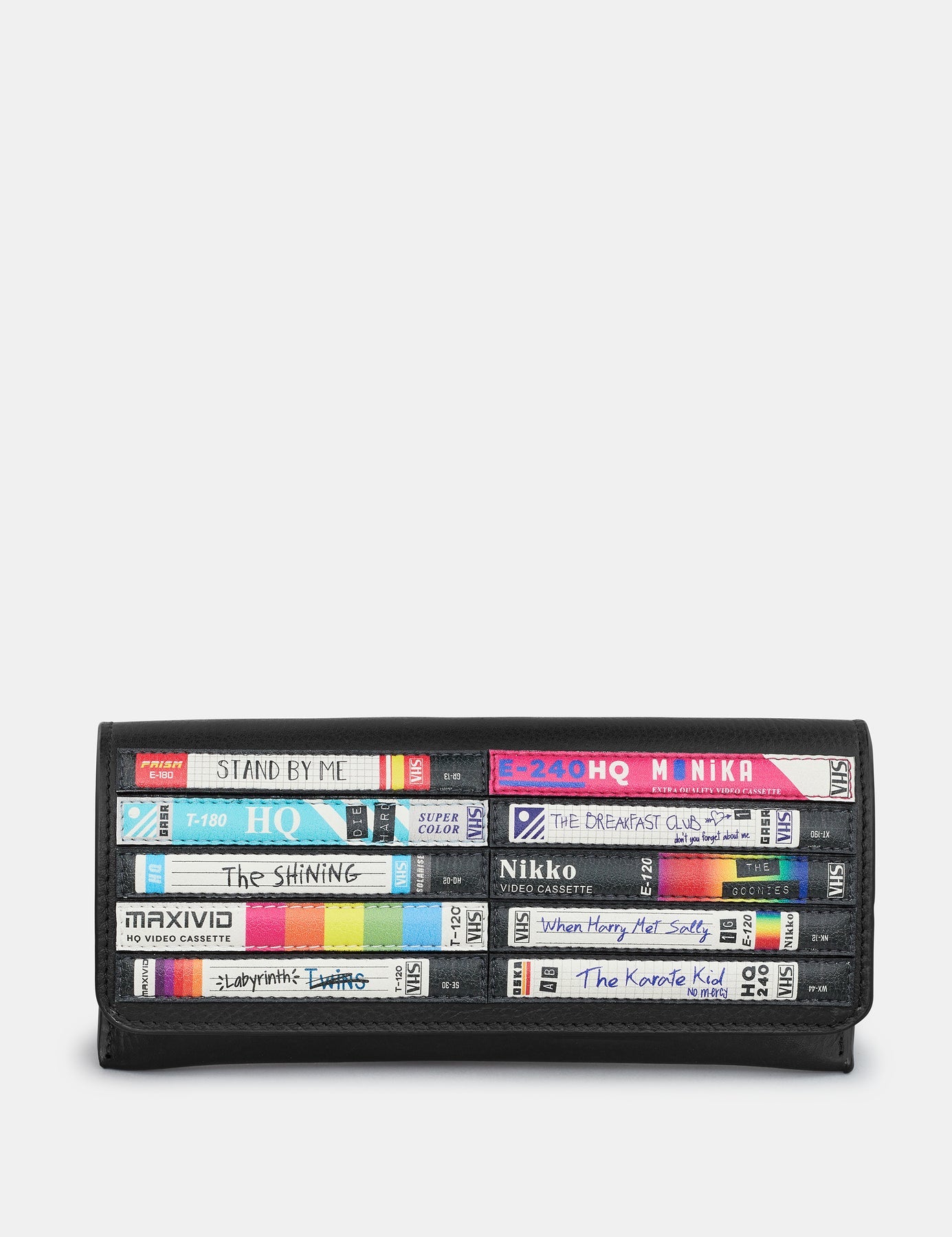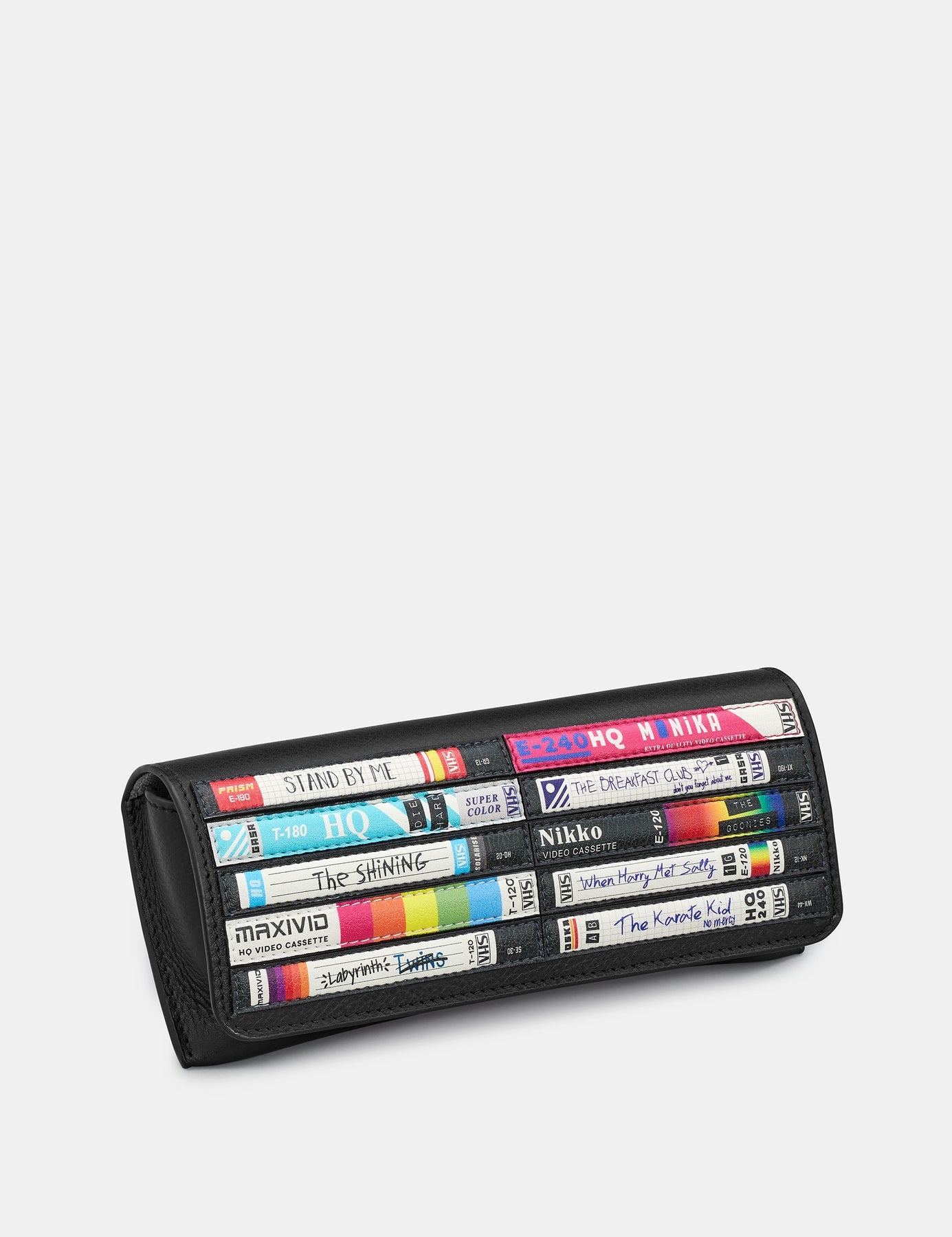 Protect your glasses or sunglasses with this leather glasses case which has been finished in a black leather. There's a bold pop of colour with our retro VHS video cassette appliques featuring iconic 80's movie appliques on the front of this leather glasses case. This VHS themed glasses case for men and women is fastened with a magnetic fastener.