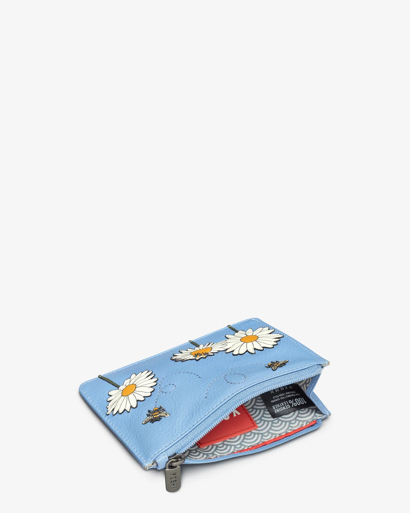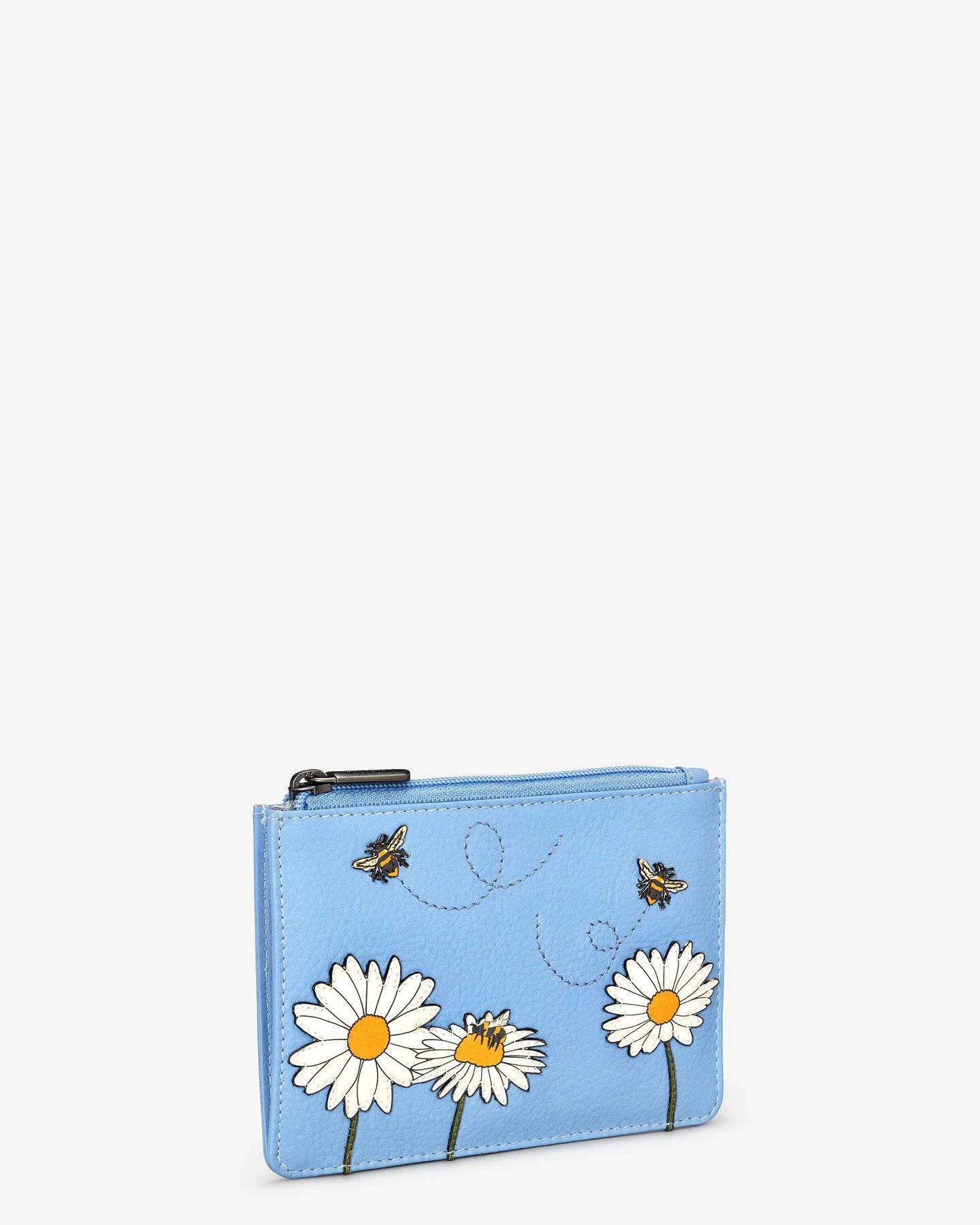This Bee Happy ladies leather purse is a slimline design with zip-top fastening which fits perfectly into any handbag or pocket. This Franklin design features beautifully hand sewn Bees and Daisy Flower appliques on the front and fits cards, folded notes, and coins on the inside and also has a really useful back card slot for your most used debit / credit or travel card etc.