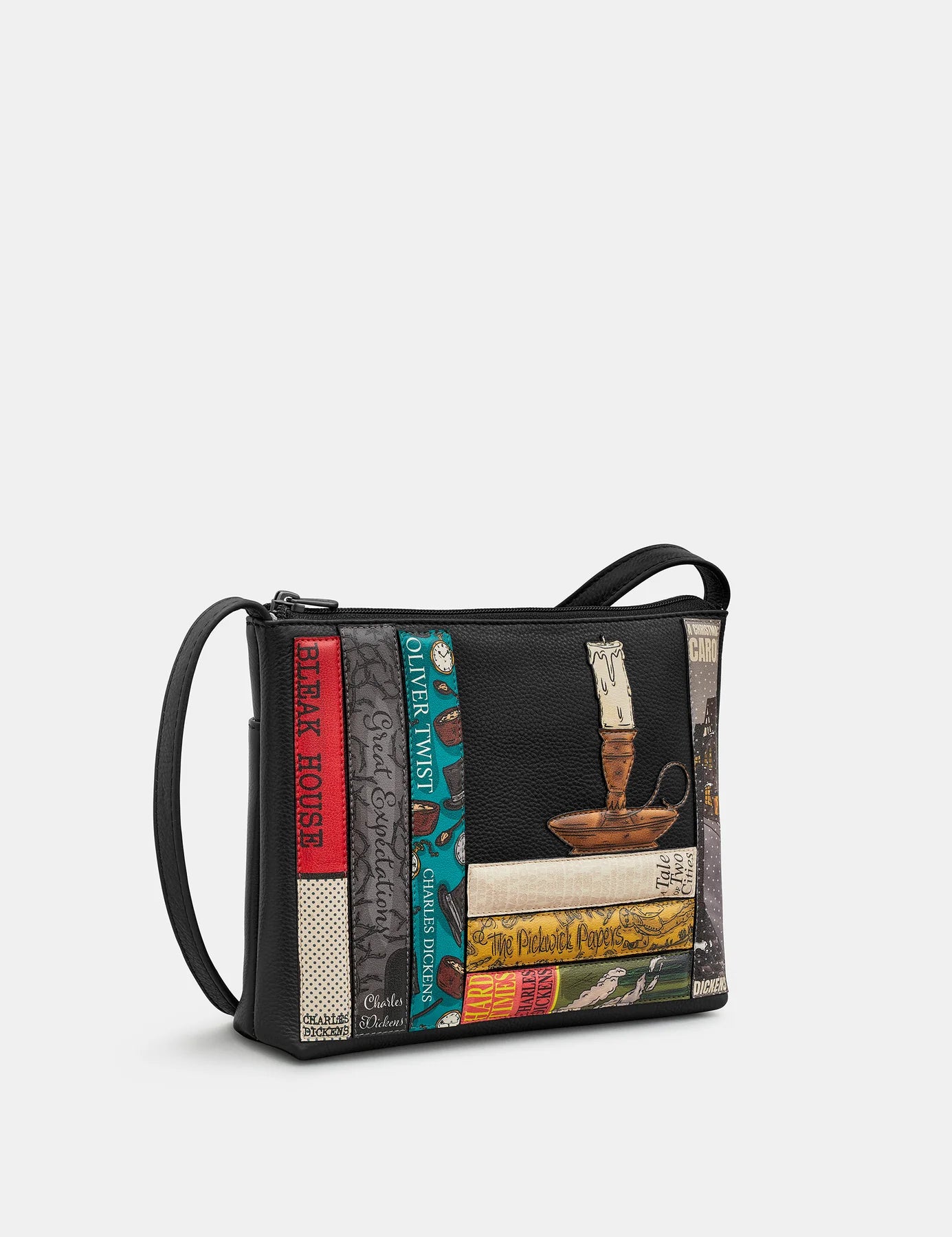 Charles Dickens is a literary genius and widely regarded as the greatest novelist of the Victorian era. Here we pay tribute with this leather cross body bag featuring his most loved works. Each of the famous book titles have been hand drawn to capture the tone and themes that are contained within the novels. From the industrialist ideas of Hard Times to the enchanting and slightly spooky a Christmas Carol, these novels pop on the front of the bag. This zip top womens style is from our bookworm range and has an adjustable strap, lots of storage, and a useful back outer pocket.
