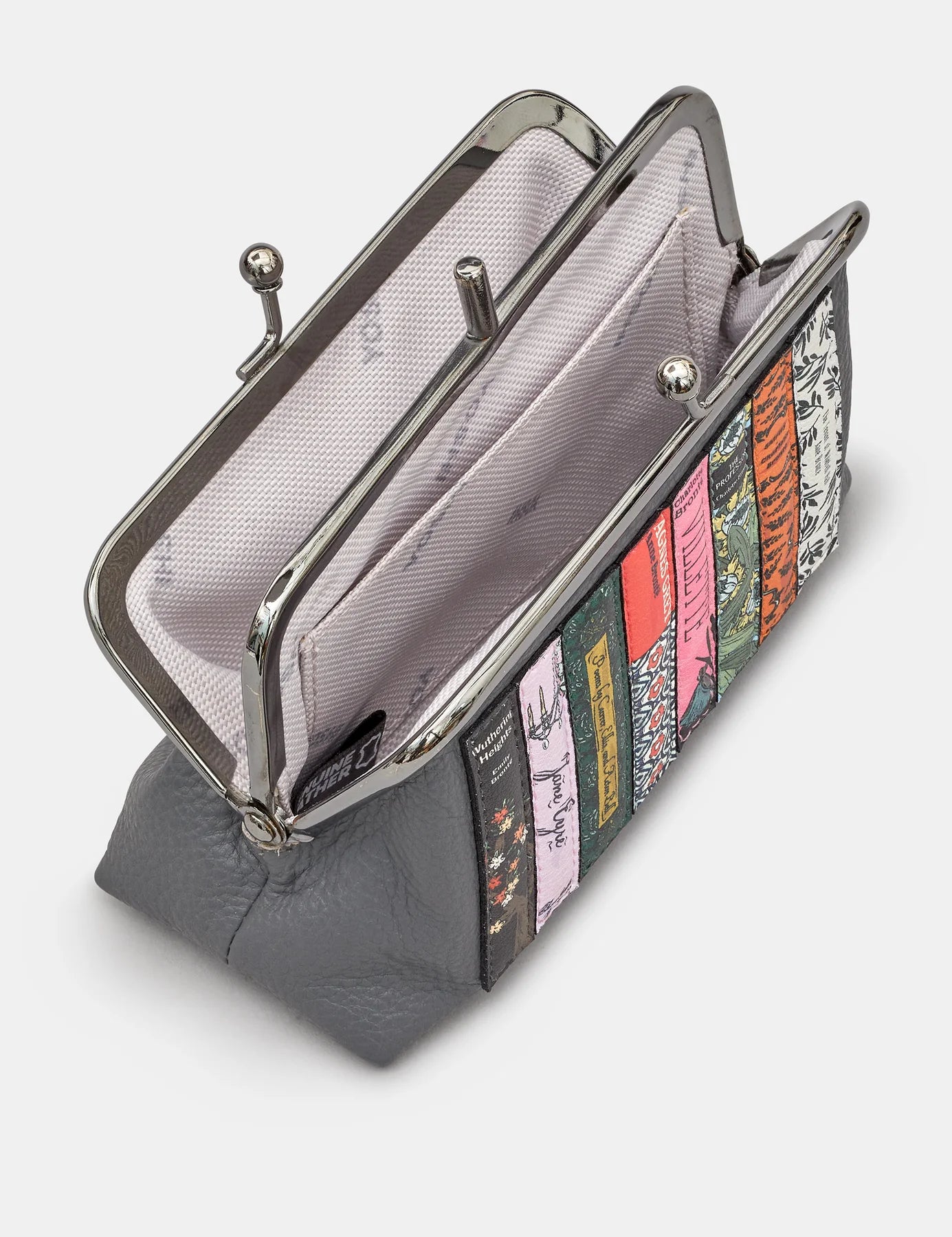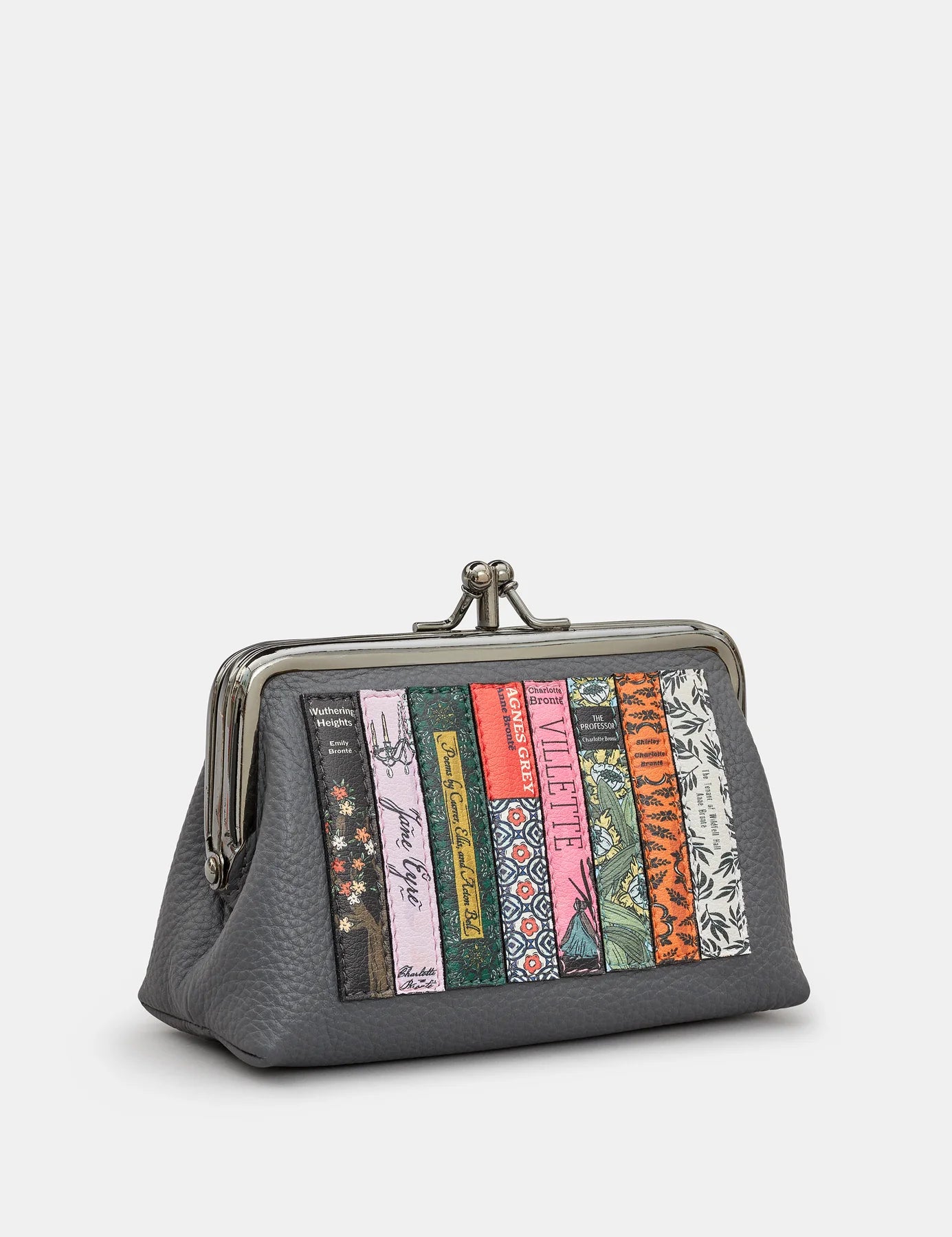 Our grey leather Bronte bookworm frame purse is the perfect choice for any bookworm. A selection on their most famous works have been recreated into detailed applique bookends on the front of this purse which has all the space inside for your essentials including cards, coins and notes.