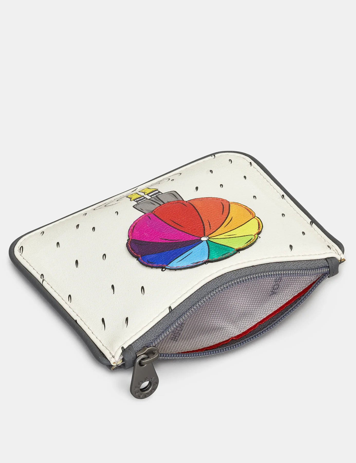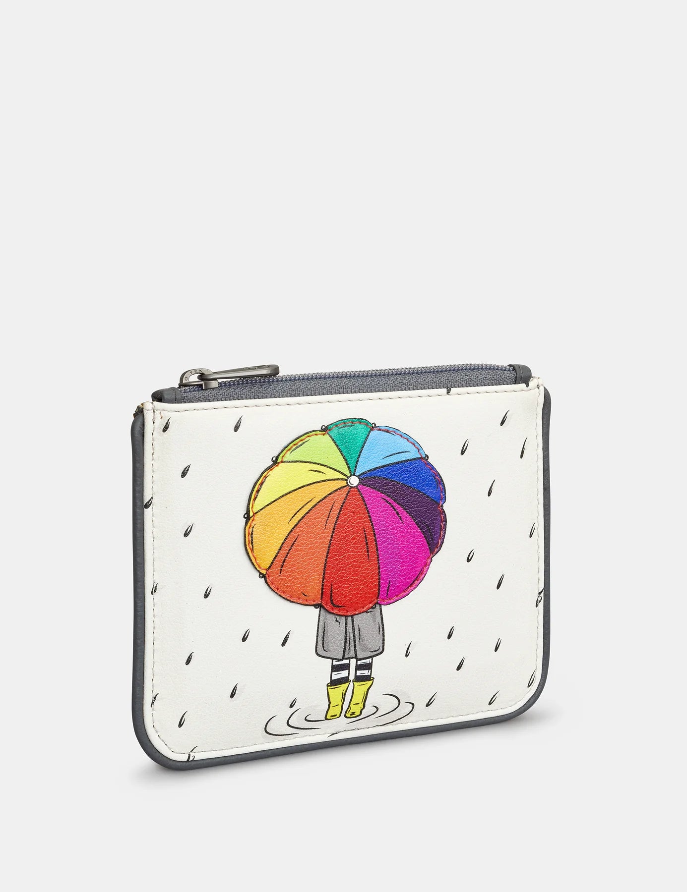 A rainy day is depicted by the ultra colourful umbrella on the front of this zip top leather purse. This women's purse style has RFID Protection and is a lovely compact design which fits nicely into any pocket or bag with space for coins, cards, and bank notes etc.