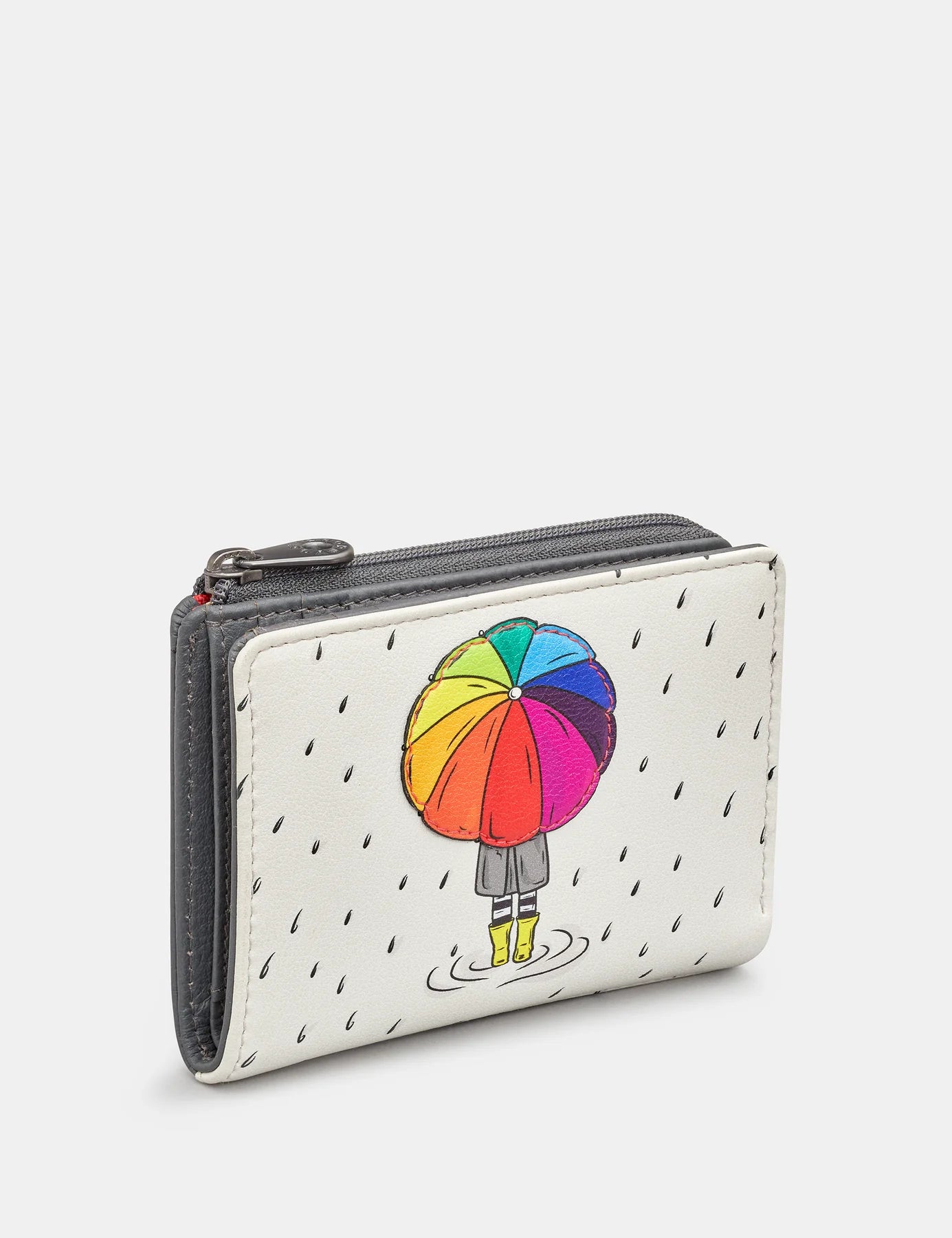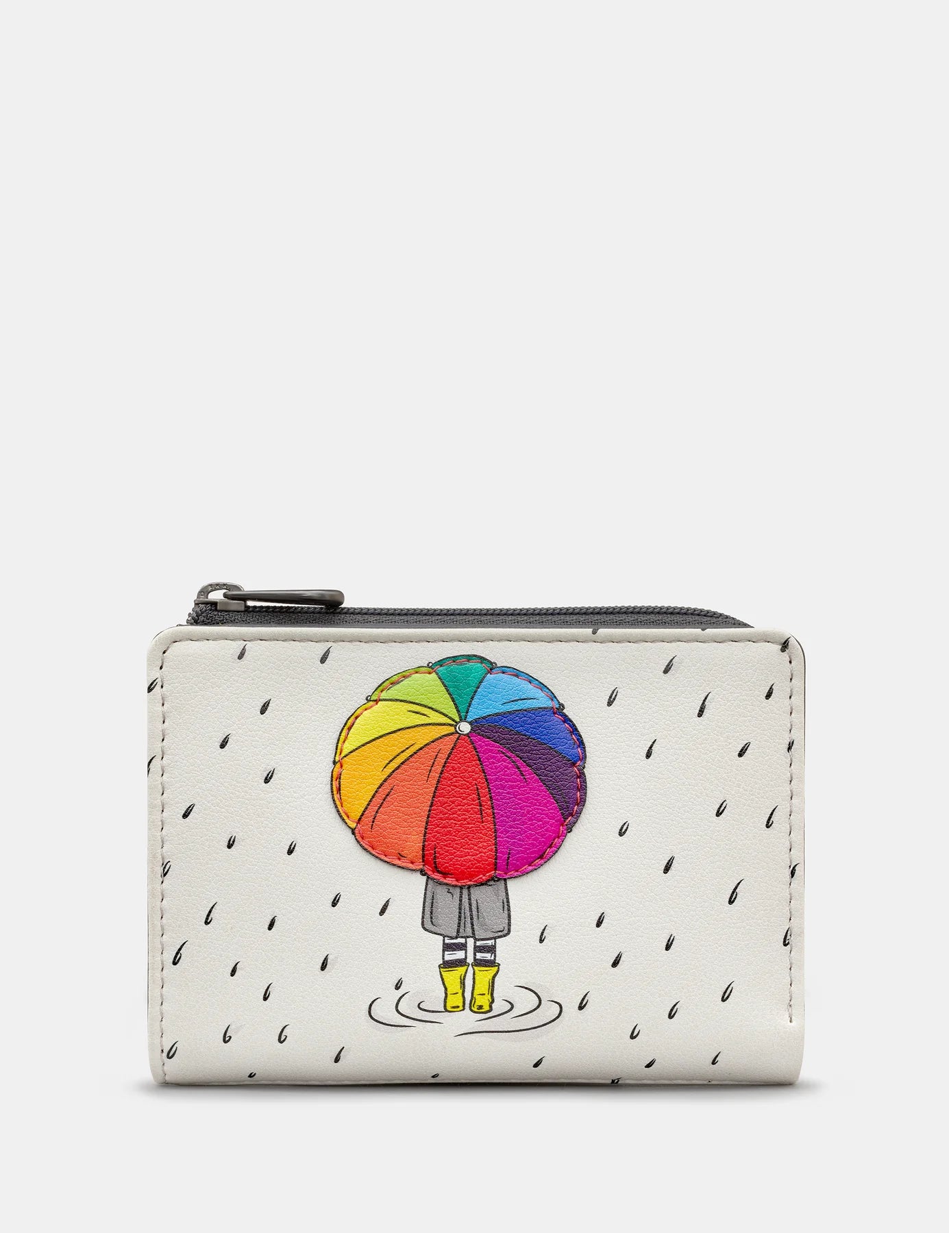 Our rainy day purse is brightened up by the rainbow umbrella which has been made into a lovely applique detail. This flap over ladies style fits all of your belongings inside - cash, coins and cards and also has RFID for added peace of mind. Rain, rain go away!!!