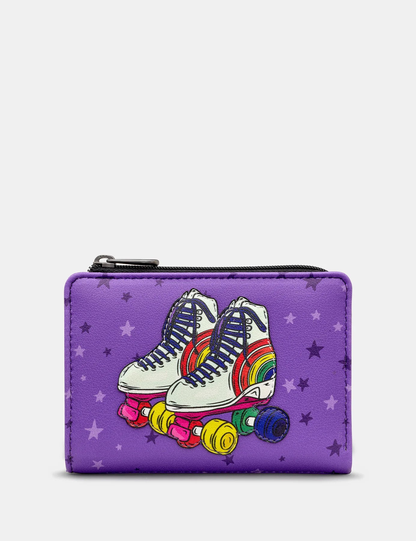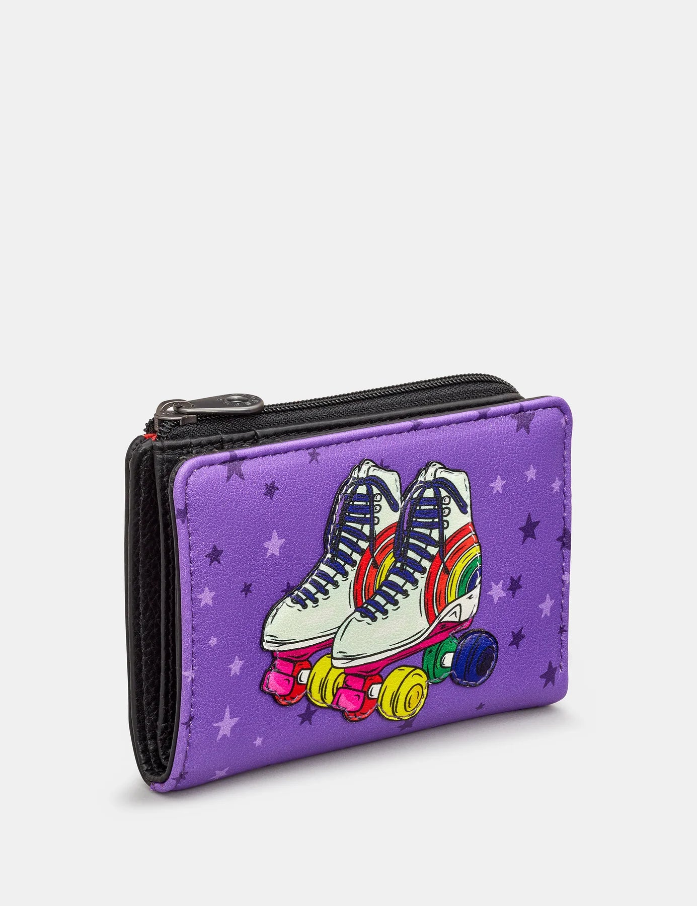 Our flap over style celebrates our love for all things Roller Skating. The colourful rainbow Quad Skates on the front of this ladies leather design have been made in to a detailed handcrafted applique and makes it the perfect style for all occasions whether at a roller disco or just out and about. Inside there is space for your bank notes, coins and cards as well as having RFID.