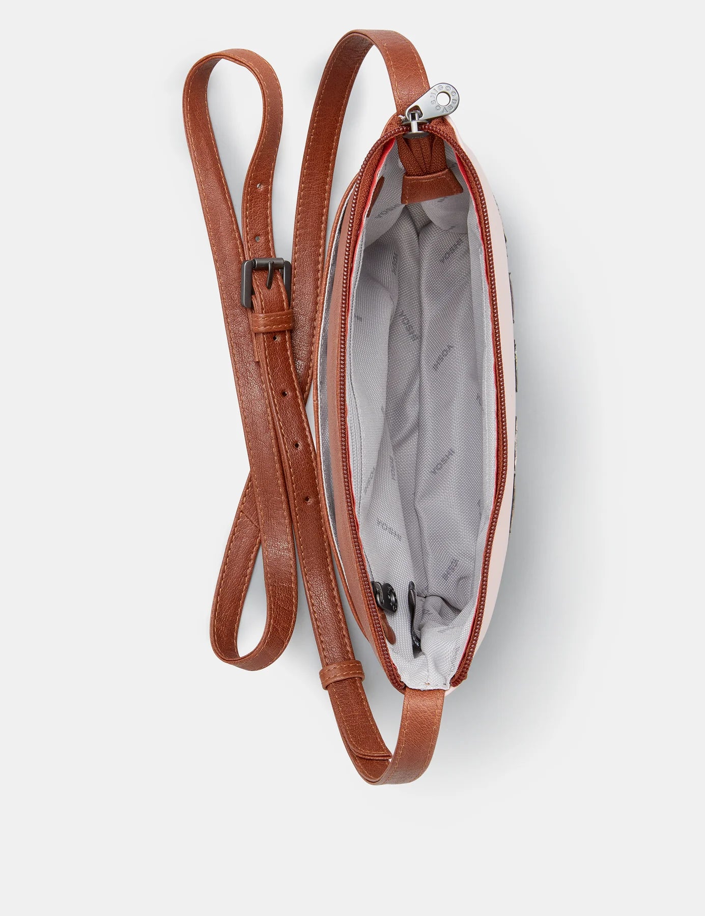 It’s been a summer of celebration so far and this jaunty, fun-loving gang are not planning to miss out on the front of this leather cross body handbag for women. Our cool cats are feline fine with their laid back party style. Our handsome Bengal keeps it sharp in his preppy tie, whilst our Devon Rex goes full on rockstar in retro star shades. This leather cross body bag can be worn across the body or over the shoulder.