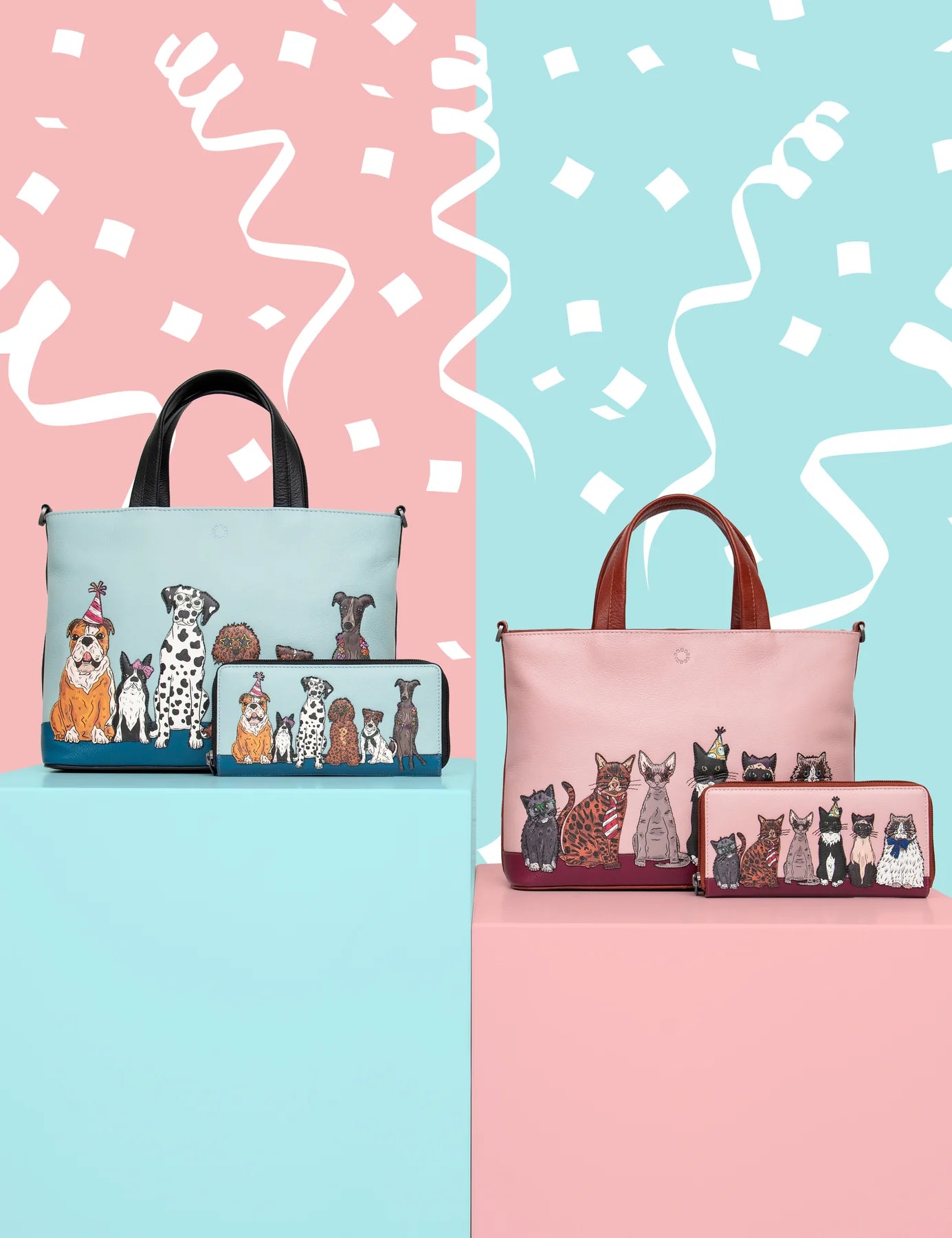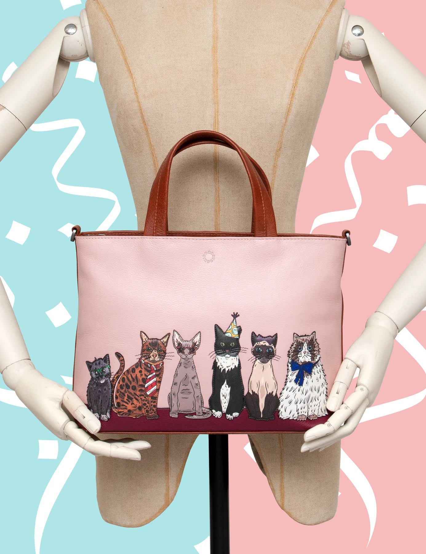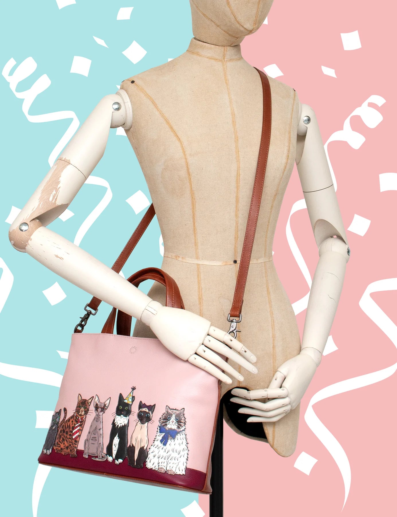 It’s been a summer of celebration so far and this jaunty, fun-loving gang are not planning to miss out on the front of this leather grab bag for women. Our cool cats are feline fine with their laid back party style. Our handsome Bengal keeps it sharp in his preppy tie, whilst our Devon Rex goes full on rockstar in retro star shades. This multi-functional grab bag features a detachable shoulder strap to offer more versatility and can worn different ways.