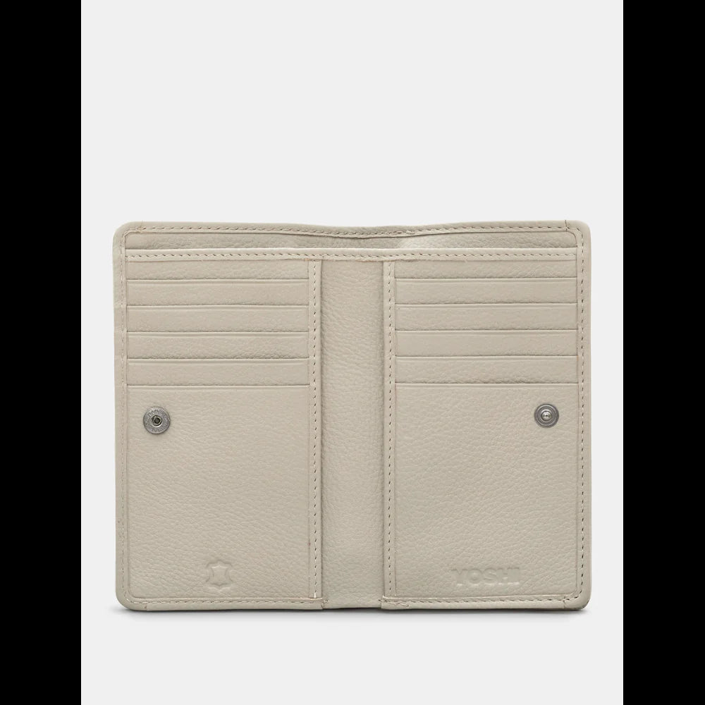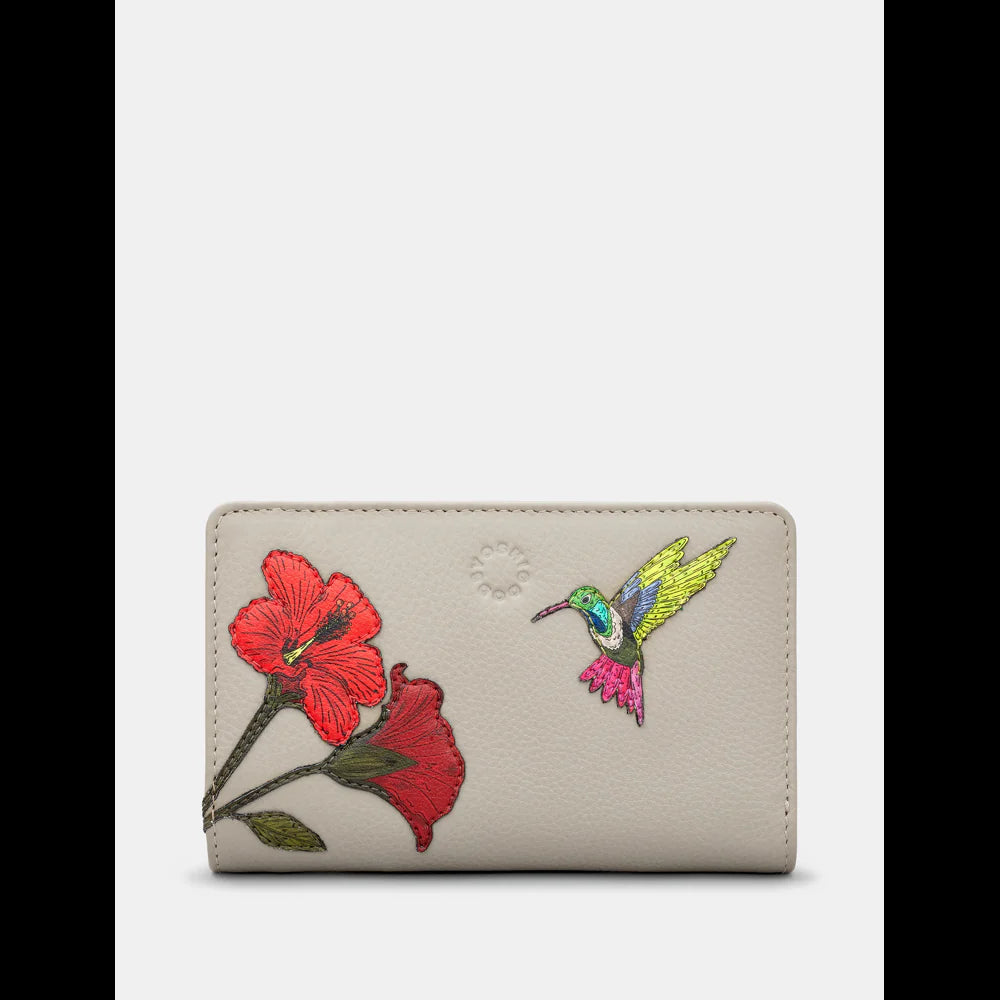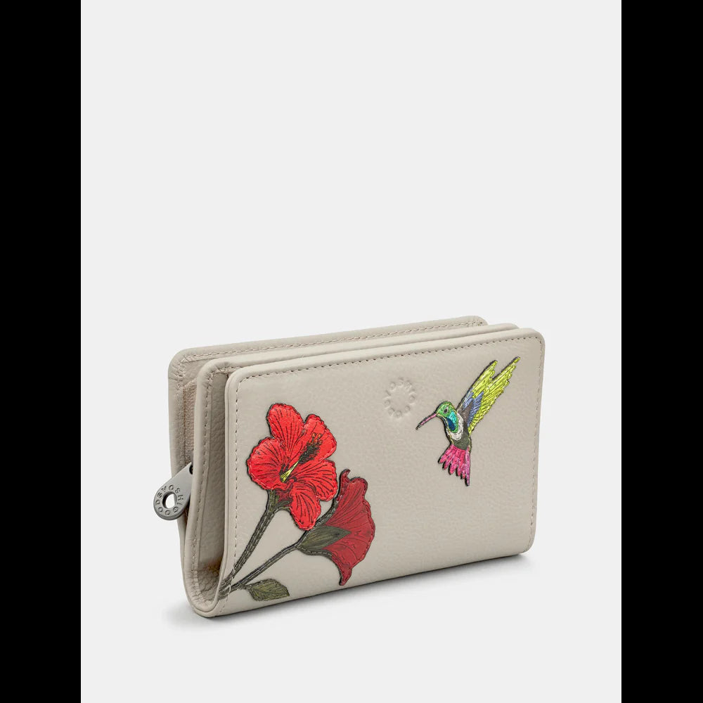 Yoshi Petal & Feathers Hummingbird Appliqued Leather Flap Over Zip Round Warm Grey Leather Purse - Y1089 HMB HMB 46