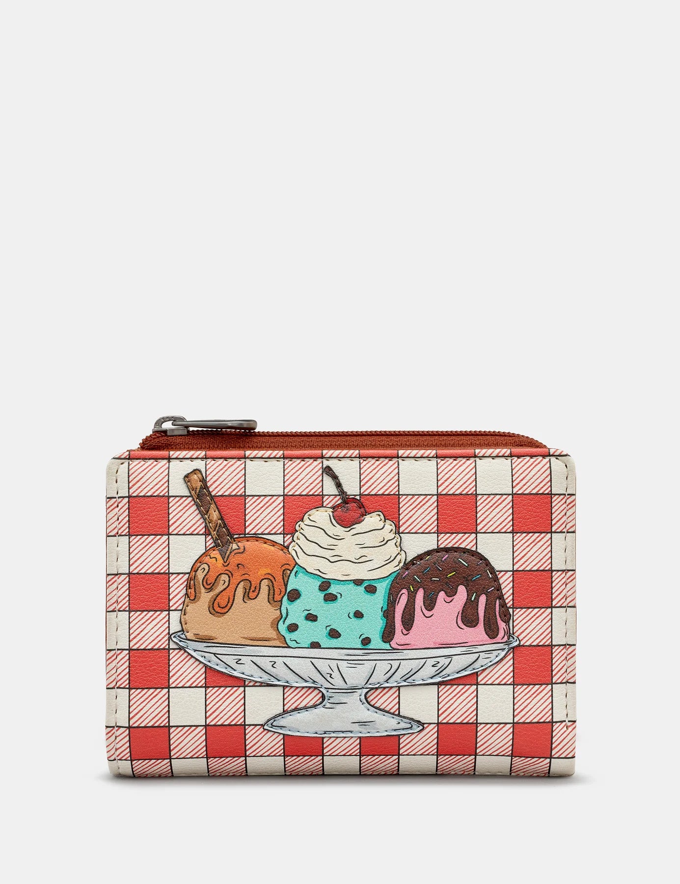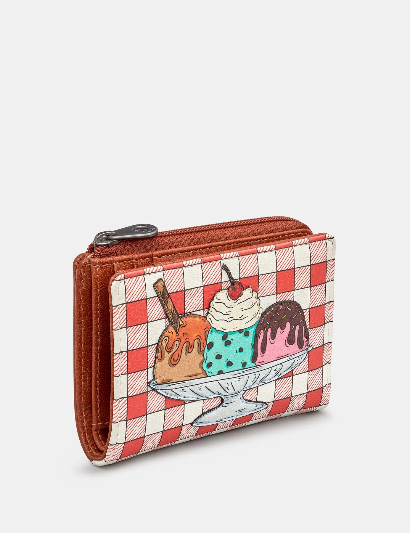 Our Three Scoops flap over ladies purse looks good enough to eat with delicious ice cream taking pride of place on the front. This tasty looking flap over design has RFID and is a compact size whiles still having lots of inside storage.