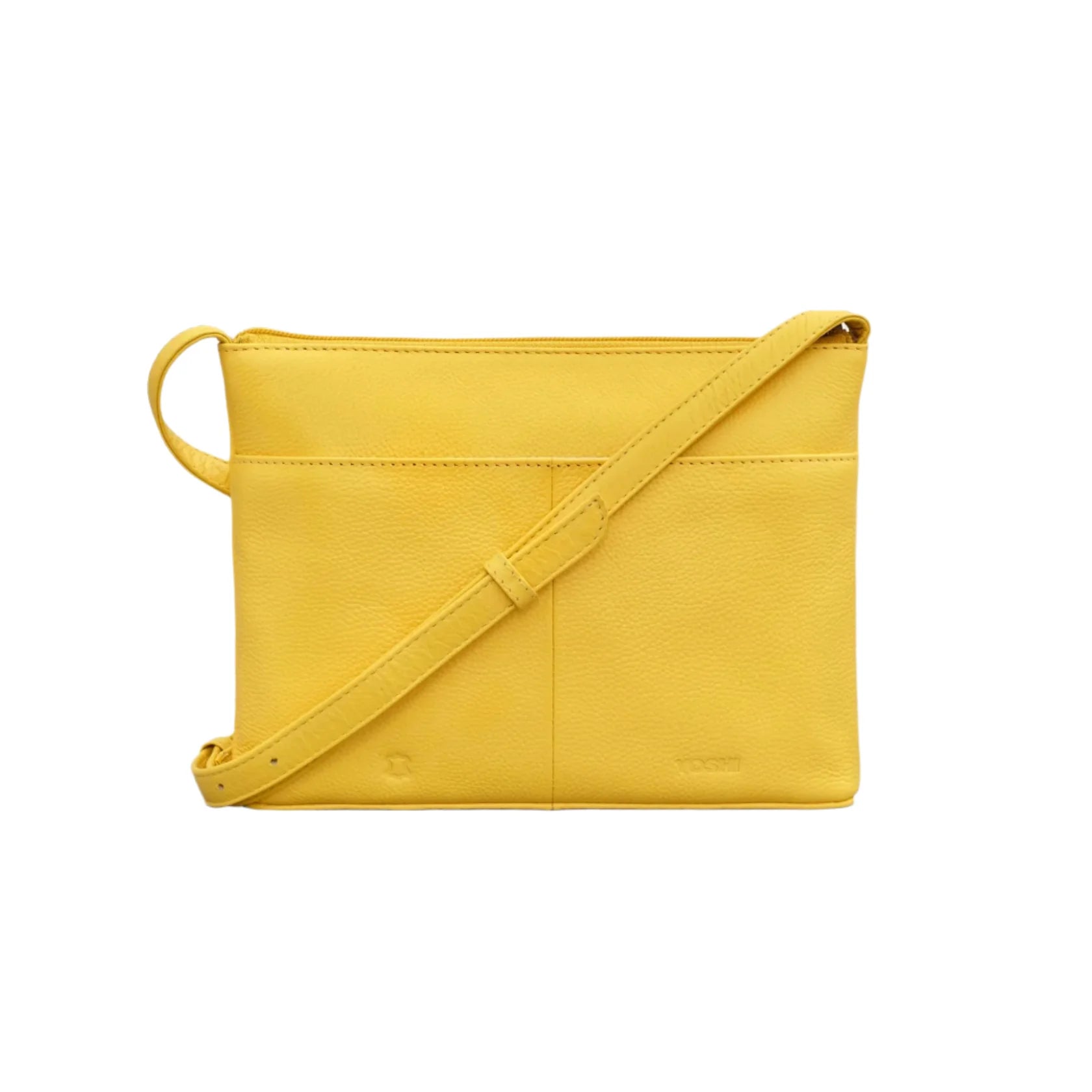 Our Wildflowers soft buttercup yellow leather cross body bag from Yoshi Goods features a colourful floral print on the front and is perfect for all occasions day and night.